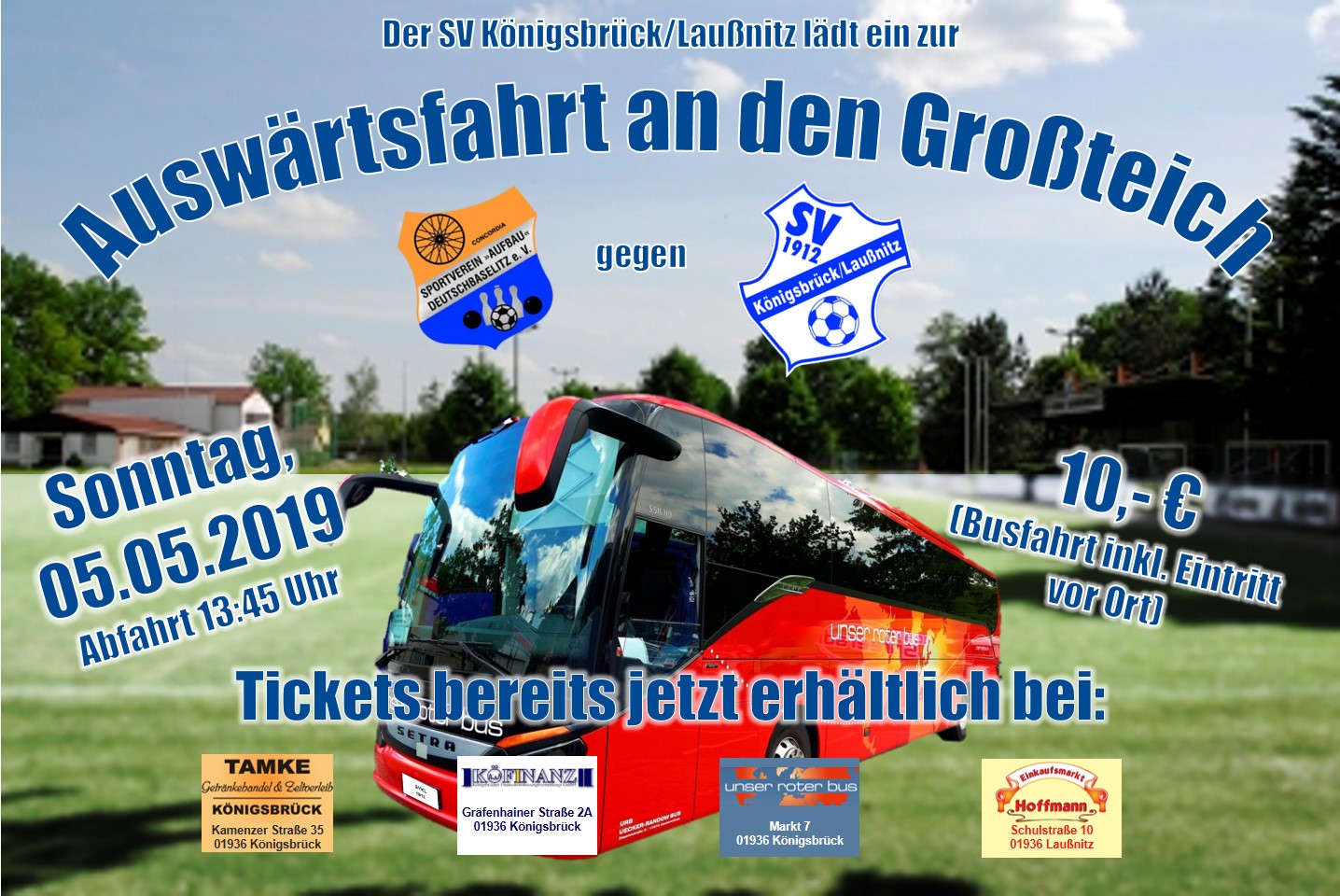Am Sonntag, den 05.05.2019 bestreitet die erste Männermannschaft ihr Auswärtsspiel beim SV Aufbau Deutschbaselitz. Für alle Anhänger und Interessierte bietet der SV Königsbrück/Laußnitz an diesem eine Busfahrt an den Großteich an.